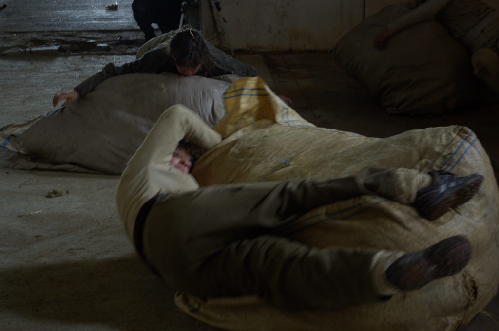 Re-Localizing is a tribute to physical labor, and to local sheep wool production. Three performers (Johanna Autin, Julie Lefebrve, Jeanne Robert) are unconventionally physically, and very slowly, moving three big-bags of raw wool (200lb) on the ground, grass, concrete. They are using Contact Improvisation Techniques, their weight, their breathing, and their endurance, they are changing the weight distribution of their bodies onto the big-bags, and thus making them move, roll, and cross the space of the Vernand Farm during this event.