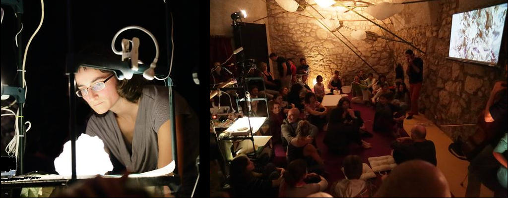 This performance is built around a very low tech live/animation drawing set up. The drawing is filmed as it is being made and directly projected onto a screen. Poetico-scientific readings, slow manipulation of a cloud like carded fleece, and the sounds of 4 cristal bowls add to the performance.