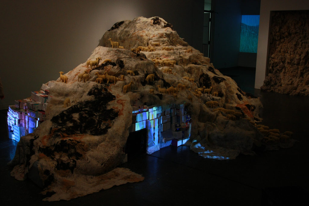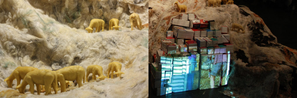 By engaging in this farm’s activities, I immersed myself in the day-to-day lives of sheep farmers. I cultivated relationships of trust, learning and exchange around a material in which we all shared a common interest: wool. In this installation, I address the question of wool production through the notion of transformation. As such, harvesting and experimenting transform themselves into matter, while sound and video transform into space/site, becoming an experience for the viewer. It is also a question of transforming documentary material into the illusory space of an installation, of transforming surface (felt) into volume, and volume (containers) into structure. By using felting techniques, I form woolen mountain landscapes inhabited by a herd of miniature sheep made of wax and fat. Through the combination of different scales, from the miniature sheep to the miniature yet nonetheless engulfing landscape, I place viewers in a position of constant change. This allows them to engage in a conceptual, imaginary and sensory back-and-forth between fiction and reality.